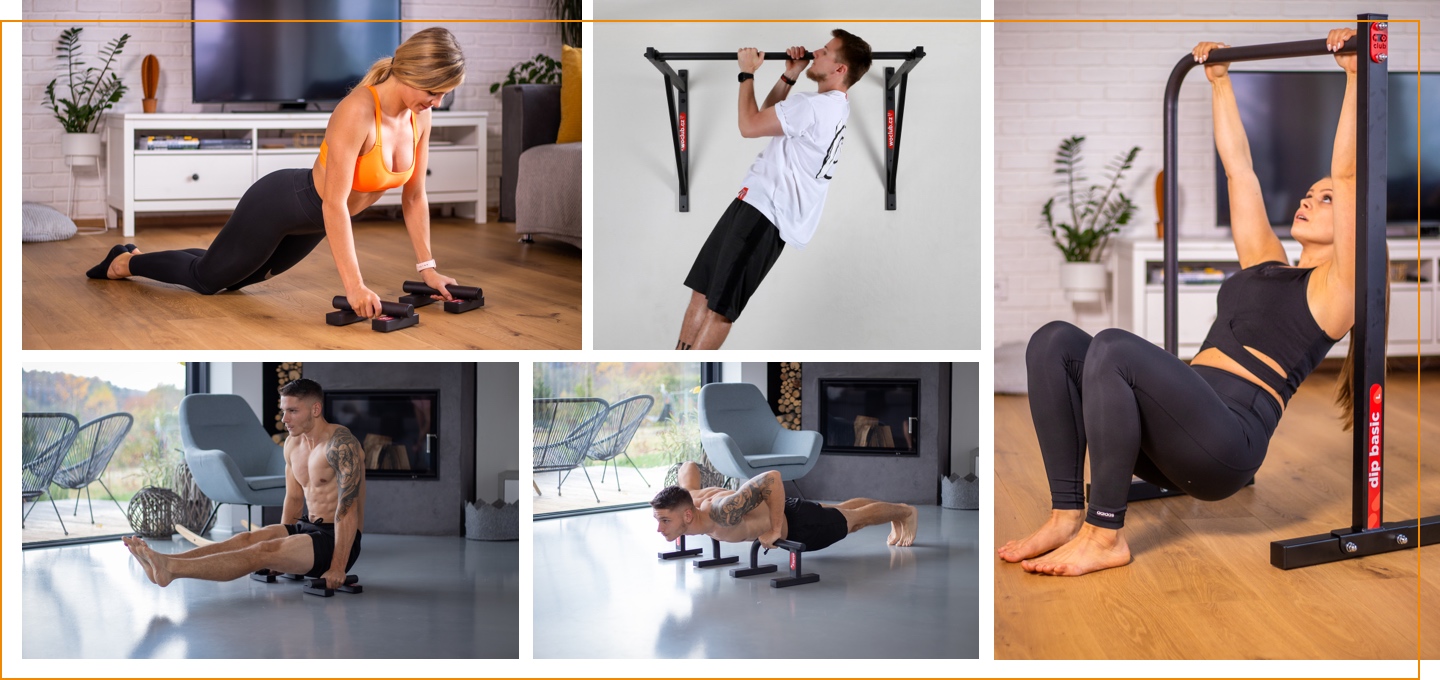 Pro plnohodnotné využití našich produktů a rozšíření počtu a náročnosti cviků ti ještě doporučíme doplnit výbavu o doplňky typu odporová guma, švihadlo, gymnastické kruhy apod.